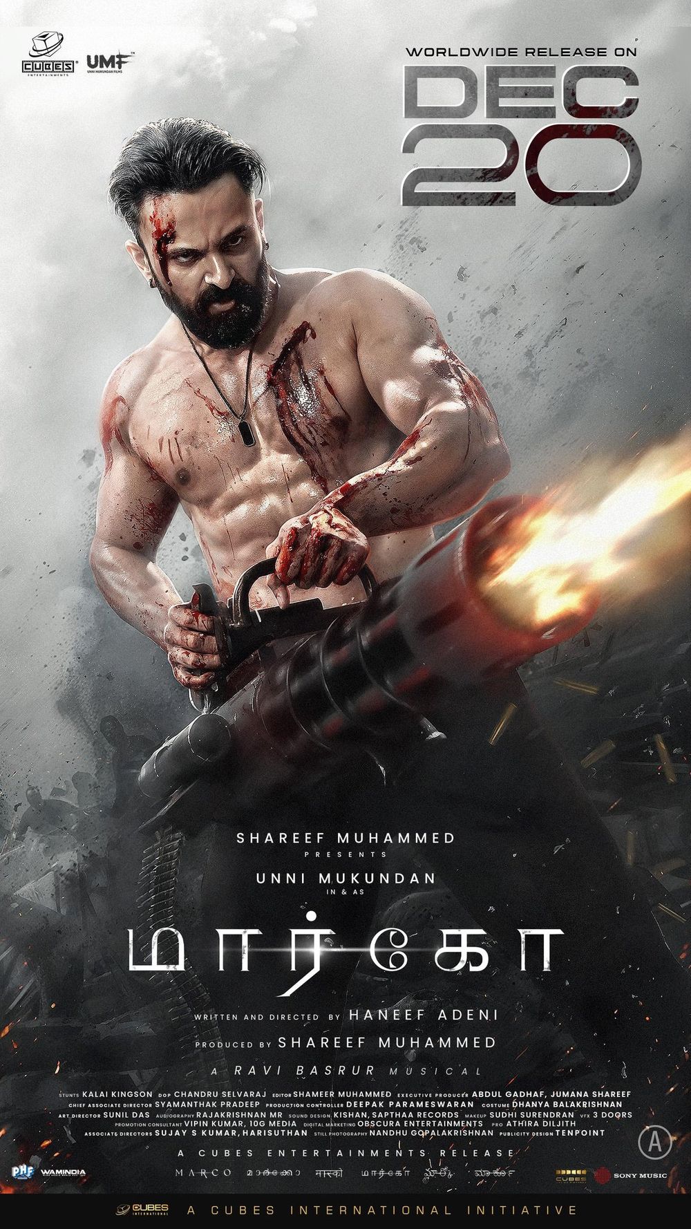 Crew: Haneef Adeni (Director), Chandru Selvaraj (Director of Photography), Ravi Basrur (Music Director)