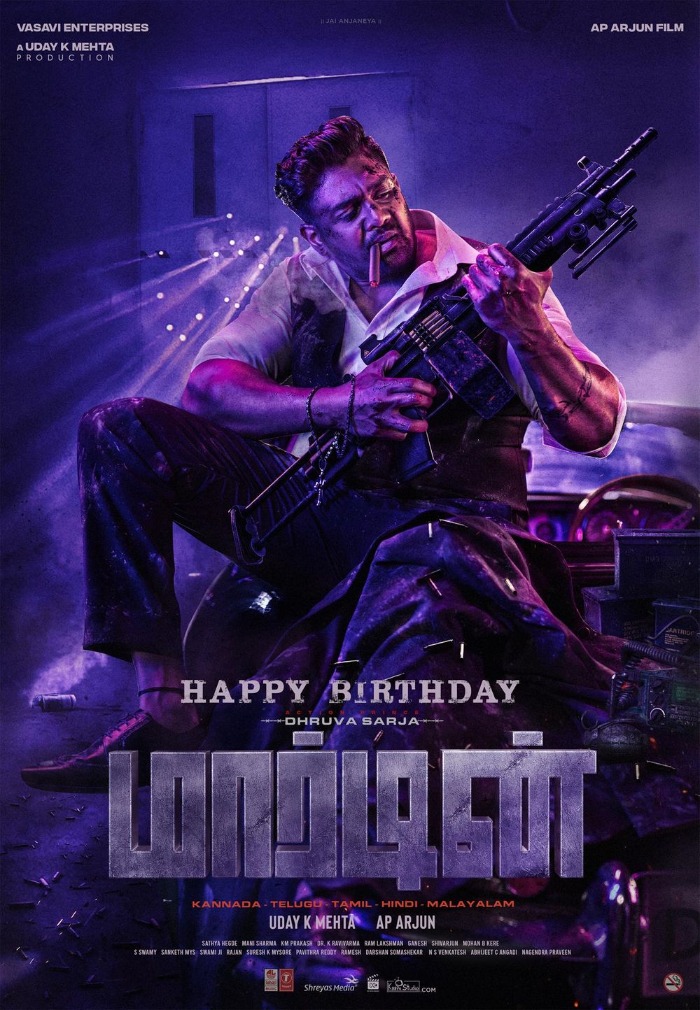 Crew: AP Arjun (Director), Amy Arnold (Director of Photography), Mani Sharma (Music Director), Ravi Basrur (Music Director)